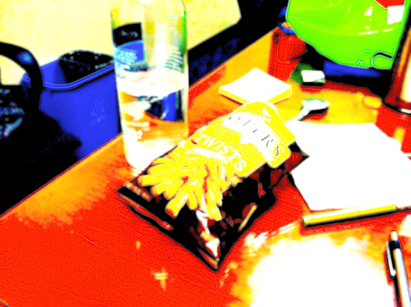 The bag of pretzels photographed through a weird, confusing filter.