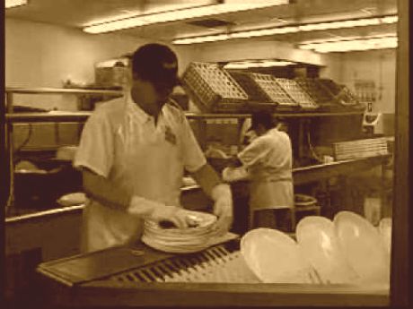 I lifted the plastic lid I was still scrubbing away at to the boys. “Hot water-hot water! Clean-clean!!” Then I banged the lid twice on the rim of my “manager sink” to drive home the point. I hoped using some of my “managerial muscle” would calm my boss down and get him off my back. Unfortunately he looked over by the emergency door.