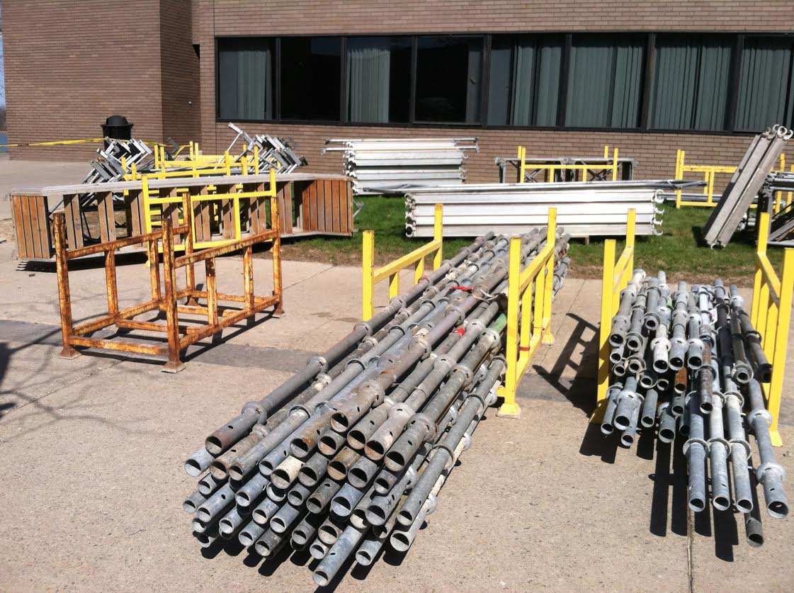 Indeed, according to blueprints shared exclusively with the Lankville News, the scaffolding is of the welded aluminum-alloy type, with base sections in widths of 29-inch or 4-feet, six inches, and spans of eight feet between frames. It features two diagonal braces and one horizontal brace, and allows the placement of intermediate extension and guardrail sections, using individual end frames and braces. The scaffolding also boasts a leveling mechanism for uneven terrain. Provided that alloy couplers are used with the light but sturdy alloy tubing, the scaffolding should be impervious to corrosion, according to experts we consulted.